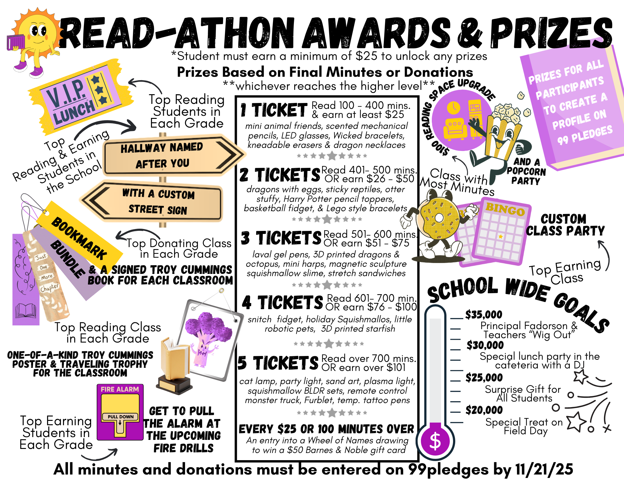 Back for it’s second year, this exciting event combines the joy of reading with the chance to support our school. It’s simple: your child will read books of their choice and seek pledges from family and friends. Not only will this encourage a love for reading, but it will also help raise funds for school supplies, activities, field trips, and many fun surprises for all students!